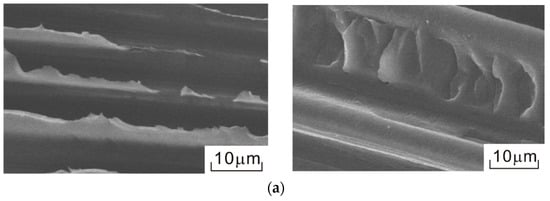 Although Mode I type crack opening at the edge of the bonding is considered to be the main fracture mode in the flexural tests used in this study, the hackles, which were caused by shear stress under Mode II, were microscopically observed on the fracture surface shown in Figure 16a. In the tensile lap-shear tests, we have reported that the tensile lap-shear strength is improved by CNT deposition on the surface of the carbon fibres due to the anchoring effect of CNT [9]. Similar to the results of the tensile lap-shear tests, resistance welded CFRTP using CNT grafted carbon fibre as the heating element showed higher flexural strength.