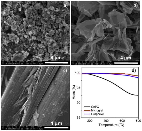 (a–c) Scanning electron microscopy (SEM) images and (d) thermogravimetric analysis of the GnPC, Micrograf, and Graphexel starting materials, respectively.
