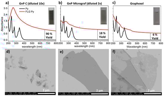 The FLG aqueous suspensions prepared were analyzed by UV-visible spectroscopy (Figure 2a–c). The starting Py solution showed the typical absorption peaks between 200 and 600 nm [], and the FLG suspensions spectra showed absorption over the whole wavelength range as expected for the graphene dispersions [,]. The suspensions of FLG from GnPC and Micrograf (Figure 2a,b) were highly concentrated for UV-visible analysis and, thus, were diluted (10× and 2× respectively). The spectra of these stable FLG suspensions showed an absorption peak at about 265 nm, which was similar to that of graphene and graphene oxide suspensions [,,]. The Graphexel FLG suspensions (Figure 2c) presented considerable lower intensities, and the Py original peaks were barely visible for the FLG suspensions, which was reported to be due to the π–π interactions between Py and exfoliated graphite [,].