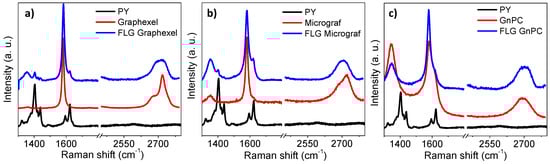 Raman spectroscopy is an important tool for the characterization of graphene and graphite-based materials, and it was used to evaluate the quality of these materials and their exfoliation into FLG [,]. A previous statistical study performed with Raman spectroscopy demonstrated that the exfoliation of Graphexel and Micrograf in Py solution yielded approximately 80% of FLG, while GnPC yielded approximately 30% of FLG []. However, GnPC flakes have small lateral sizes and are already highly exfoliated in the starting material, thus forming concentrated aqueous suspensions. The graphite-based suspensions used in this work for composite preparation were characterized before and after exfoliation. Typical Raman spectra of Graphexel, Micrograf, and GnPC are presented in Figure 3. The Raman spectrum of Graphexel (Figure 3a) was typical of graphite. The G band was present at 1581 cm−1. The D band, which normally is observed around 1350 cm−1, was barely identified, indicating the good structural quality of this graphite. The 2D band position occurred at 2722 cm−1, presenting the typical asymmetric shape observed for graphite. Conversely, the FLG Graphexel (Figure 3a) showed a down-shift of the 2D band to 2702 cm−1 and a more symmetric shape indicating the formation of more exfoliated flakes. The D band of FLG Graphexel presented higher intensity compared to its starting material, which may be related to the presence of Py at the surface of the exfoliated material []. Also, the characteristic peaks of Py can be observed in these spectra.