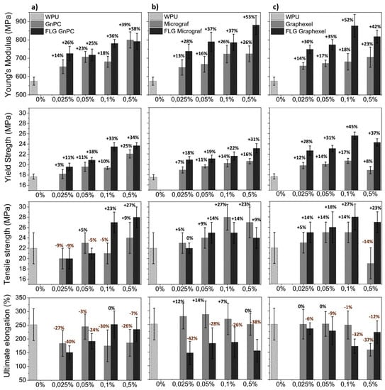Young’s modulus, yield strength, tensile strength, and ultimate elongation of the waterborne polyurethane (WPU) composite films at different loadings of graphitic starting material and FLG for (a) GnPC, (b) Micrograf, and (c) Graphexel. The % values indicate the increase/decrease relative to WPU films.