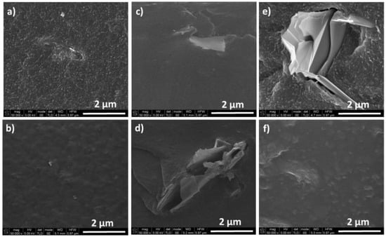 SEM images of 0.5 wt.% WPU composites of: (a) GnPC, (b) FLG GnPC, (c) Micrograf, (d) FLG Micrograf, (e) Graphexel, and (f) FLG Graphexel.