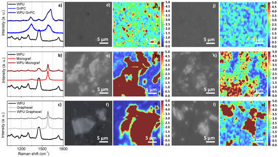 (a–c) Representative Raman spectra of WPU, graphitic starting material, and its corresponded WPU composites for GnPC, Micrograf, and Graphexel, respectively; (d–f) optical microscopy images and (g–i) color-coded Raman mapping for the GnPC, Micrograf, and Graphexel WPU composites at 0.5 wt.%, respectively; (j–l) optical microscopy images and (m–o) color-coded Raman mapping for the FLG GnPC, FLG Micrograf and FLG Graphexel WPU composites at 0.5 wt.%, respectively.