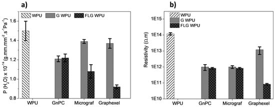 The coefficient of moisture permeability (P(H2O)) of the composite films of as-received graphite and FLG was calculated according to the specifications of ASTM E96. The results obtained for P(H2O) of WPU and WPU composite films at 0.5 wt.% loading are presented in Figure 7a. It was observed that the incorporation of the graphite materials (pristine and FLG) reduced the value of P(H2O). For the films containing GnPC and FLG GnPC no significant difference was observed, both films induced a decrease of 19% for P(H2O) relative to the WPU films. A decrease of approximately 10% in permeability was observed for films with Micrograf and Graphexel, however for FLG Micrograf and FLG Graphexel the decrease in permeability relative to WPU films was further enhanced to 28% and 39%, respectively, showing the effectiveness of FLG as a barrier to moisture. The higher performance of FLG Graphexel may be attributed to its larger flake lateral size. In fact it was reported that large lateral size particles as well as large aspect ratios enhanced the barrier properties even for randomly orientated fillers into the matrix [,]. Furthermore, the FLG/WPU composite films prepared in this work presented a higher barrier performance compared to other results reported in the literature. Yousefi et al. reported a decrease in P(H2O) of 25% relative to WPU for GO/WPU 0.5wt.% composite [], and a decrease of 28% for highly oriented reduced GO/polyurethane composites [], while Wang et al. found a decrease of 6% in P(H2O) for MoS2/WPU 0.5wt.% composite [].