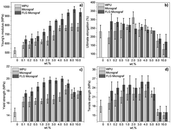 (a) Young’s modulus, (b) ultimate elongation, (c) yield strength, and (d) tensile strength of the Micrograf and FLG Micrograf WPU composite films at different loadings.