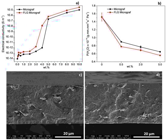 (a) Electrical conductivity; (b) coefficient of moisture permeability; and SEM images for the Micrograf (c) and FLG Micrograf WPU (d) composite films at different loadings.