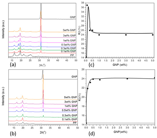 Figure 3a,b shows the XRD patterns registered for neat PP, GNPs, and their composites at different GNP loadings prepared with both extruders. The fraction of PP β-phase formed (