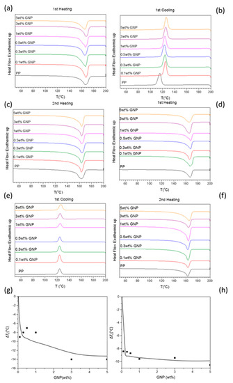 23], it is essential to understand the effects of processing on the properties of the final composites. Therefore, this study aimed to correlate the effect of GNP addition on the crystallization behavior of PP and understand the role that the processing conditions employed in composite preparation play in inducing PP crystallization.