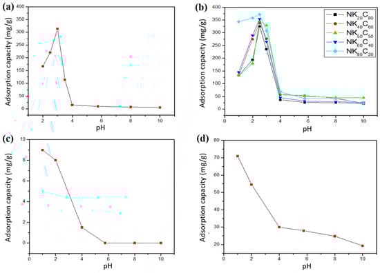 Effect of pH on the adsorption capacity of (a) chitosan, (b) nanocomposites (NCPs), (c) kaolinite, and (d) activated charcoal.