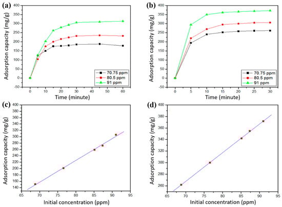 Effect of contact time on the adsorption capacity of (a) chitosan and (b) NK80C20; effect of the initial concentration of Remazol Red (RR) on the adsorption capacity of (c) chitosan and (d) NK80C20.