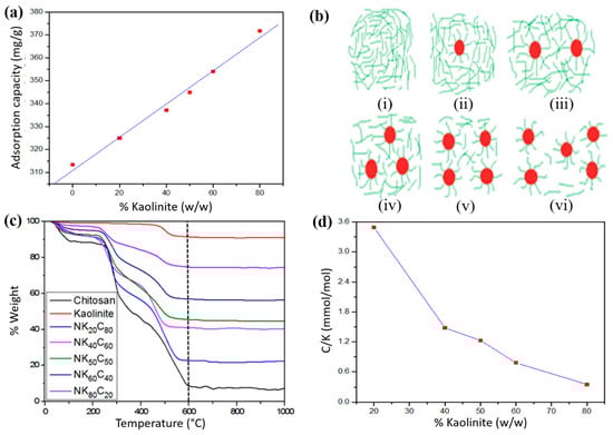 (a) Effect of kaolinite content on the adsorption capacity of NCPs; (b) proposed interaction between kaolinite and chitosan: (i) chitosan, (ii) NK20C80, (iii) NK40C60, (iv) NK50C50, (v) NK60C40, and (vi) NK80C20; (c) thermogravimetric analysis (TGA) thermograms; and (d) effect of kaolinite content on the loading of chitosan on kaolinite.