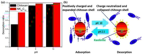 With the gradual increase in pH of the media, there was a progressive increase in the desorption of RR from both chitosan and NK80C20. As depicted in Figure 4b, the dye molecules were trapped on the NCP surface at pH 2.5 but at pH 10, the captured dye molecules were liberated from the surface. Therefore, the adsorbent was regenerated and was ready to be used again. From this schematic representation, it can be concluded that the interfacial interaction of NK80C20 with RR was reversible, and was completely controlled by the pH of the medium. This interfacial interaction was further confirmed by recording the FTIR spectrum of dye-loaded NK80C20 (Figure S2). Chitosan and NK80C20 showed the highest desorption ratios of 0.967 and 0.999, respectively, at pH 10.0. The dye molecules might be trapped inside the spiral polymeric chains of chitosan. However, in the case of NK80C20, the spiral chains could be more disentangled. This factor might contribute to the higher desorption of RR from NK80C20 than from chitosan.