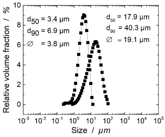 The resin Tetraglycidylmethylenedianiline (TGMDA, EpikoteTM RESIN 496, Hexion Inc., Columbus, OH, USA) is tetra-functional with an epoxy equivalent of 115 g/eq and was cured with Diethyltoluenediamine (XB3473TM, DETDA, hydrogen equivalent weight 43 g/eq). Graphite (Imerys Graphite & Carbon, Bodio, Switzerland) with the trade name Graphit Timrex® KS6 and KS44 was used as conductive filler. The filler is characterized by a platelet-shape and an average particle size of 3.6 μm (D50) and 18.4 µm (D50), according to the manufacturer. The density is 2.255 g/cm3. The particle size distribution was measured and can be found in Figure 1. The data measured in our lab slightly differs from the manufacturer’s data. A PAN based fiber 12K A-49 (DowAksa, Atlanta, GA, USA) with a tensile strength of around 4900 MPa and a Young’s modulus of 250 GPa has been used for the prepreg production.