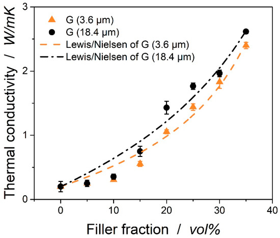 where is defined as the filler content and as the conductivity of the matrix. The factors and C reflect the filler geometry, orientation and thermal conductivity. According to Guth [30], A can be calculated with the aspect ratio of the filler:
