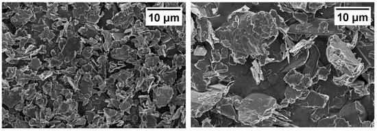 SEM of small (3.6 µm) and large (18.4 µm) graphitic particles at a magnification of 2 K. Samples from LFA have been broken manually.