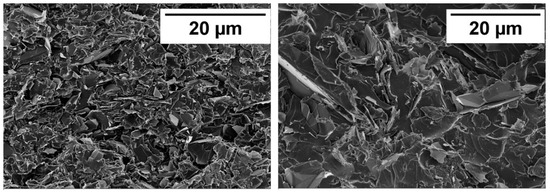 Besides the size of the filler shown in Figure 4, the morphology of the samples is crucial for the evaluation of the results from the thermal conductivity. Several methods have been used to study the morphology, from which µCT and SEM seem the most promising. The µCT scans of composites with particles of 3.6 and 18.4 µm are shown in Figure 5. One can clearly see that no voids can be found in the material. The distribution of the filler seems very homogenous. The voxel-size of the µCT is ~2.5 µm, so agglomerations of the micro-sized graphite particles can be excluded. For a deeper investigation of the morphologies, several SEM pictures have been taken. Figure 6 shows two fracture surfaces of composites with 3.6 and 18.4 µm graphitic platelets. Both confirm the homogenous distribution in the matrix.