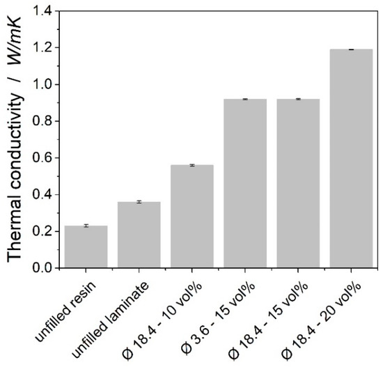 Figure 7 shows the thermal conductivities of the prepreg laminates measured by LFA. The unfilled resin has a thermal conductivity of 0.23 W/mK, which is increased to 0.36 W/mK by the incorporation of carbon fibers. The values are lower than those of other researchers. Rolfes and Hammerschmidt used fibers with a transverse thermal conductivity of 2 W/mK with round carbon fibers; they measured a transverse thermal conductivity of 0.708 W/mK with 64.3 vol% of fiber with the steady-state guarded hot plate (GHP) setup. For the cross-section type used in this study, Shim et al. showed a significantly lower thermal conductivity [4]. The values are also not comparable, as different measurement methods have been used, and given that Rolfes and Hammerschmidt already showed that there is a strong variation in the measured thermal conductivity with the GHP and the THS methods [2]. When the conductive graphite filled resin with a thermal conductivity of 0.7 W/mK is used for the prepreg production, the conductivity in the laminate increases to 0.91 W/mK for the large particles.