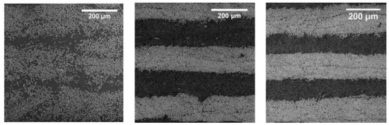 Figure 8 shows records from µCT of the prepreg laminates. The images show that the samples are very homogenous. From the pictures that have been evaluated, no voids could be found in the prepreg laminates. For a deeper understanding of the morphology of the prepreg laminates, optical microscopy has been used to produce and analyze polished micrograph sections. In the unfilled laminate, the fibers are well distributed. They are not absolute homogenously distributed, as resin-rich areas can be detected in the cross-section. The laminates with filled matrices have a layered structure with layers of resin and layers of fiber. As can be seen in Figure 9, the distance between the carbon fiber layer varies between 80 and 200 µm. From the evaluated images, no direct contact between the carbon fiber layers could be found.