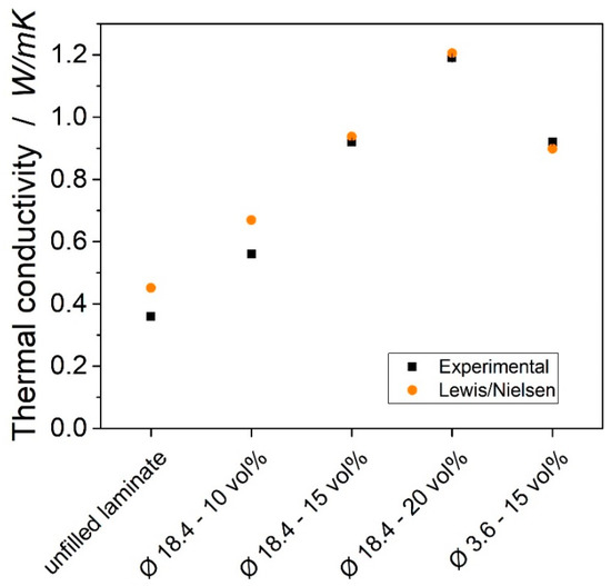 Thermal conductivity of the laminates from the experimental data and calculated according to Lewis/Nielsen equations.
