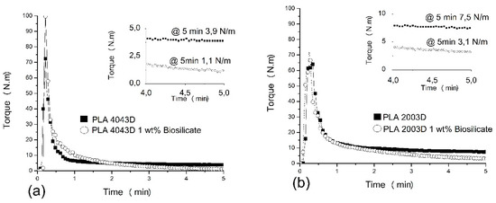 Torque versus time for Poly (lactic acid) (PLA) 4043D (a) and PLA 2003D (b) with and without Biosilicate®.