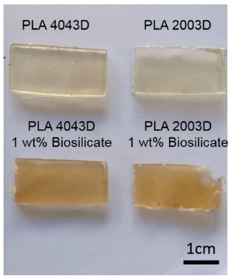 PLA matrix: Two different PLA matrices were used in this study, PLA 2003D and PLA 4043D; both were provided my Natureworks® (Minnetonka, MN, USA). PLA 2003D it is a grade specific for extrusion, D-isomer of 3.5 wt. %, and has molecular weight around 120.000 g/mol whereas PLA 4043D is specific for films, D-isomer from 4.5–5 wt. % and has molecular weight around 110.000 g/mol. The Biosilicate® used is a quaternary system of 23.75Na2O–23.75CaO–48.5SiO2–4P2O5 (wt. %), average particle size (d50) of approximately 5 μm and was kindly provided by Vitreous Materials Laboratory (LaMaV)/Federal University of São Carlos (São Carlos, Brazil) [6,7,8,9].