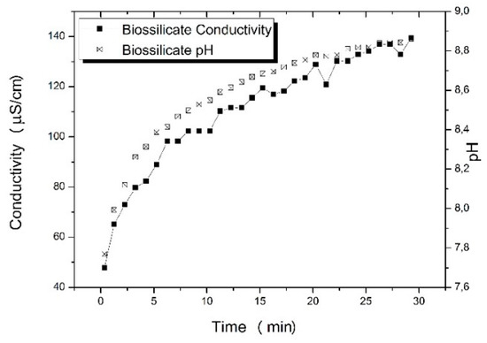 Biosilicate® was characterized by zeta potential. The test was performed with the purpose of analyzing the surface characteristics of Biosilicate® in aqueous solution, i.e., the electrical conductivity and pH variation over time. The assay was performed on a zeta potential analyzer, model ESA 9800. For the preparation of the solutions, the dispersing agent (Darvan) was used at 1 wt. % relative to the mass of Biosilicate®, with a concentration of Biosilicate® at 25 wt. % of the water mass.