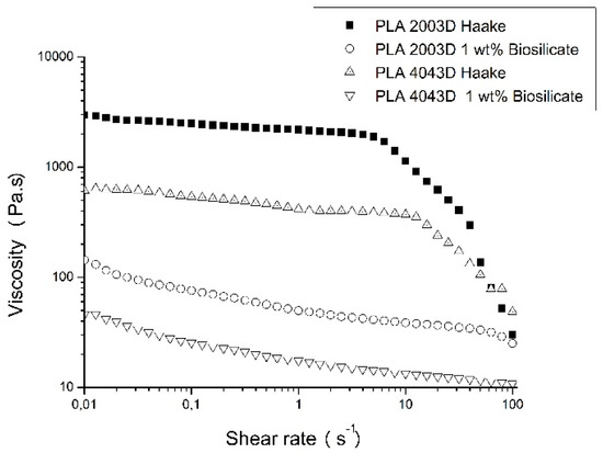 To understand the effect of the degradation behavior during melt processing, the rheological behavior of the neat PLAs and the composites were evaluated. Figure 5 presents the curves of viscosity versus shear strain for the different PLAs and the composites of PLAs with 1 wt. % of Biosilicate®. The two PLAs used in this work have similar rheological behavior; however, PLA 2003D possess higher viscosity compared to PLA 4043D. The presence of Biosilicate® reduced the viscosity of both PLAs remarkably, although the viscosity variation presented by both composites remained equivalent when compared to the pure polymers. In addition, a change in the rheological behavior of the composites with the addition of Biosilicate® is noticed. Both PLAs present a Newtonian behavior (0.01 to 10 s−1), i.e., the viscosity remained constant with increasing shear rate. The PLA/Biosilicate® composites exhibited shear thinning (pseudoplastic) behavior even at low shear rates and higher viscosity values than PLA in very low shear rates (up to 0.05 s−1). These rheological results indicate that the addition of Biosilicate® could have strongly affected the melt processing of the composites and contribute to the degradation of the PLA matrix.