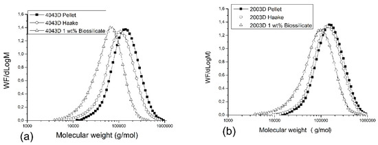 Gel permeation chromatography (GPC) curves of PLA 4043D (a) and PLA 2003D (b), with and without 1 wt. % Biosilicate®.