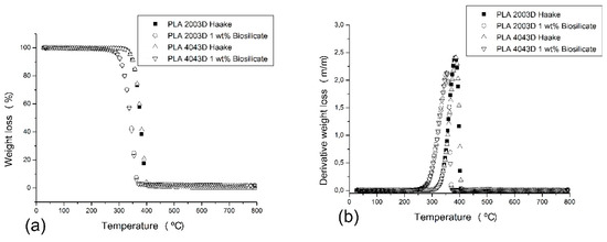 Thermogravimetric analysis (TGA) curves of PLA 2003D Haake, PLA 2003D 1 wt. % Biosilicate®, PLA 4043D Haake, and PLA 4043D 1 wt. % Biosilicate®. (a) Weight loss versus temperature, (b) Derivative weight loss versus temperature.