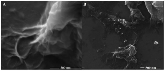 FEG-SEM micrographs for: (A) rGO and (B) rGO-AuNPs composite.