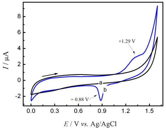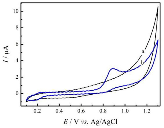Electrochemical characterization of SMZ in 0.2 mol L−1 PBS pH 8.0 in the absence (a) and in the presence (b) of 50.0 µmol L−1 of SMZ with a scanning rate of 50 mV s−1.