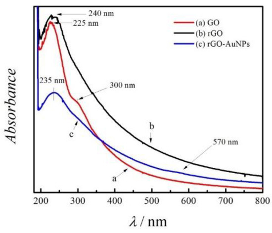 Further, the rGO-AuNPs composite was characterized by UV-Vis spectrophotometry. Figure 4 displays the UV-vis spectra of (a) GO, (b) rGO and (c) rGO-AuNPs. UV-vis spectrum of GO showed two maximum bands at 225 and 300 nm, which are due to the π → π* transition of aromatic C–C bonds and n → π* transition of C=O. However, rGO showed only one maximum band at 240 nm. These results were expected since rGO has a lower C/O coefficient due to the removal of oxygen functionalities and establishment of C=C conjugated graphene structures. The rGO-AuNPs composite exhibited a maximum band at 235 nm and small band at 570 nm. Gold nanoparticles have been reported to shows absorption bands in the range from 450–600 nm, the small band for AuNPs is due to the dilution effect of rGO-AuNPs during experimental procedures. The absorption at 570 nm is due to the plasmon resonance of AuNPs. Previous works in literature described the Fourier transform infrared (FTIR) experiments as a methodology for differentiation between GO, rGO and rGO-AuNPs. Ali et al. [35,36] investigated the modification of multi-walled carbon nanotubes (MWCNTs) with 2,2,6,6-tetramethylpiperidine-1-oxyl (TEMPO) for a symmetric supercapacitor. The Fourier-transform infrared spectroscopy (FTIR) experiments elucidated the functional groups on the modified MWCNTs and successfully characterized the composite.