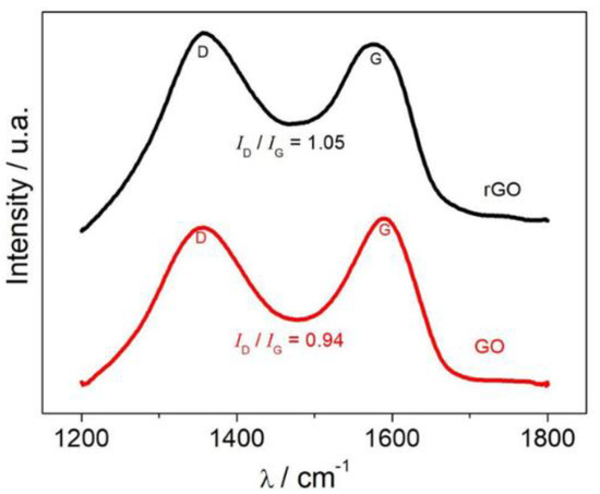 For the characterization of the GO reduction to rGO, these nanomaterials were analyzed by Raman spectroscopy as presented in Figure 5. It was observed that the synthesized GO and rGO presented two characteristic absorption bands in its Raman spectrum: the G band at around 1585 cm−1 and the D band at 1355 cm−1. The G band corresponds to the bond stretching of sp2 carbon pairs. The D band is associated with the breathing mode of aromatic rings with dangling bond in-plane terminations [18]. The relationship between the intensity of the D band (ID) and G band (IG) is usually employed to evaluate the size of the in-plane sp2 domains for carbon materials. The obtained values for the ID/IG ratio was 0.94 and 1.05 for GO and rGO, respectively. The higher magnitude of the D band for the rGO suggests an increase in disorder, and indicates that during the reduction of GO, most of the oxygenated functional groups were removed, resulting in a decrease in the average size of the sp2 domains [37].