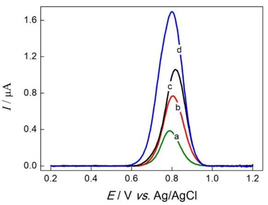 To compare the electrochemical performance of the proposed electrode in determining SMZ, DPV experiments were performed in the potential range +0.2 V to +1.2 V vs. Ag/AgCl/KCl (3.0 mol L−1) in a 0.2 mol L−1 PBS (pH 8.0) containing 5.0 μmol L−1 of SMZ, using the following electrodes: GC (a curve), GC/GO (curve b), GC/rGO (curve c) and GC/rGO-AuNPs (curve d), as shown in Figure 7. By observing the voltammetric profiles, it can be noticed that the maximum anodic peak currents, for all the electrodes studied, presented potentials relatively close to +0.80 V vs. Ag/AgCl KCl (3.0 mol L−1), under the conditions previously described. However, the GC/rGO-AuNPs electrode profile (curve d) exhibited the highest anodic current intensity for SMZ in comparison to the others. The increase in peak current intensity for SMZ oxidation at this electrode showed an increase of 60% when compared to the electrode containing only rGO (curve c). The GC/GO electrode (curve b) showed a 2.2-fold increase in the intensity of the peak current for the SMZ oxidation and, compared to the GC electrode (curve a), this factor practically quadrupled. The relative increase in the current values reflects the increase of the electroactive surface area, that is, a higher interaction of the analyte occurs with the active sites of the composite rGO-AuNPs synthesized compared to the others, possibly caused by the insertion of the gold in the reduced graphene sheets. Thus, the synergistic combination between reduced graphene oxide and gold nanoparticles becomes evident, leading to an increase in the peak current for the oxidation of SMZ.
