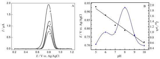 The effect of the support electrolyte on SMZ oxidation was investigated using DPV experiments. Figure 8A displays the effect of tris(hydroxymethyl) aminomethane (curve a), acetate (curve b), Britton-Robinson (curve c) and PBS (curve d) solutions at pH 8.0 in the presence of 5.0 µmol L−1 of SMZ. The PBS showed the higher anodic peak response for the analyte. Therefore, the pH evaluation and subsequent analysis were conducted using this solution.