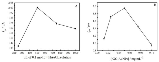 The effect of the amount of the chloroauric acid (HAuCl4) in the synthesis of rGO-AuNPs were investigated using DPV. Figure 9A shows that 500 µL (25% w/w in relation to GO) of a 0.1 mol L−1 solution of HAuCl4 had the best response for the oxidation of 5.0 µmol L−1 of SMZ. Furthermore, the amount of rGO-AuNPs composite on the electrode preparation was evaluated in the range from 0.0125 to 0.1000 mg mL−1. As displayed on Figure 9B, the amount of 0.0500 mg mL−1 was chosen for the subsequent analysis. Since higher concentrations of the composite can interfere negatively on the electron-transfer process through electrode/electrolyte interface, hence the amount of 0.0500 mg mL−1 was used for further experiments.