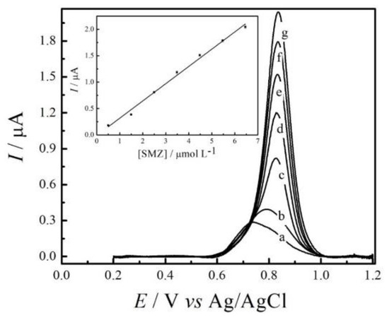 The analytical curve for the determination of SMZ, under optimized conditions, was recorded by DPV experiments (triplicate) using the GC/rGO-AuNPs electrode. The results are shown in Figure 10. The experiments revealed a good linear response to SMZ concentrations ranging from 0.5 to 6.5 µmol L−1. The respective equation is presented as follows: