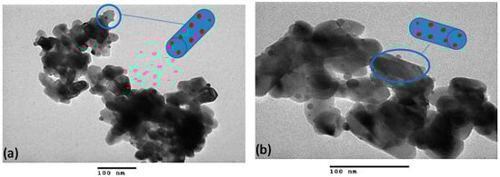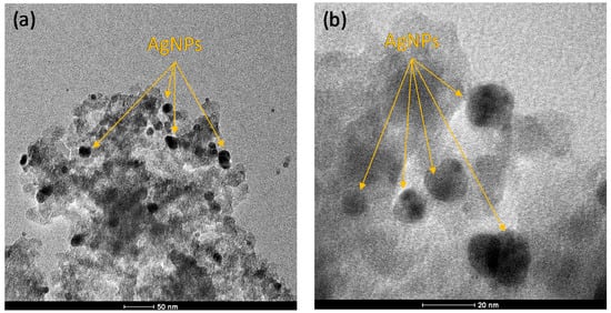 Figure 1 shows the electron microscopy images of AgNP-decorated nano-TiO2 particles. As can be seen in this figure, AgNPs (black particles, 5–10 nm) were well dispersed on the surface of nano-TiO2 particles (30–60 nm). The bigger nanoparticles are assigned to nano-TiO2 and the smaller ones are AgNPs, as described in the literature []. It is worth noting that the synthesis process of hybrid nanoparticles was optimized to obtain the reported sizes of the hybrid nanoparticles.