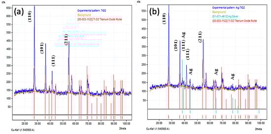 Figure 3 presents the XRD patterns of TiO2 and Ag/TiO2 nanoparticles. Figure 3a shows that the rutile phases of TiO2 exhibit several diffraction peaks, and the reflections at at (110), (101), (111), and (211) appear as the most intense, which is in line with the literature []. In the case of Ag/TiO2 in Figure 3b, the intense peak at 38° refers to a (111) reflection of metallic Ag []. Due to low concentration (as compared to TiO2 nanoparticles), other peaks of Ag are dominated by TiO2 phases.