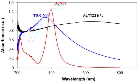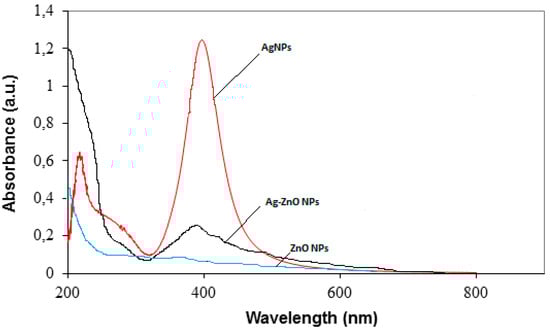 Figure 5 shows the UV-visible spectra of aqueous solutions containing AgNPs, TiO2, and Ag/TiO2 nanoparticles. In the case of AgNPs (~10 nm of diameter), a broad band around 398 nm is believed to be present due to the surface plasmon resonance (SPR peak) of AgNPs []. The absorption band for pure TiO2 nanoparticles was observed in the UV region (at 360 nm), whereas it was shifted to the visible region for Ag-decorated TiO2 nanoparticles. These results are in line with those reported in the literature for Ag-doped TiO2 nanomaterials [,]. Figure 6 shows the UV-visible spectra for nano-ZnO- and nano-TiO2-decorated with AgNPs (dispersed in water). This figure shows a broad band at the 410 nm band, indicating the presence of AgNPs on the surface of the nano-ZnO particles.