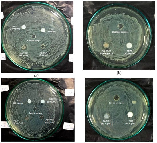 Figure 7c,d shows that TiO2 NPs did not exhibit inhibitory effects to bacteria under light irradiation (at concentration of 8–40 mg/mL). It was reported that the doping TiO2 with noble metals shifted its absorption band to the visible region []. Without UV irradiation, pure TiO2 nanoparticles did not inhibit bacterial growth. However, Ag–TiO2 core–shell nanoparticles exhibited a good antibacterial activity against both E. coli and S. aureus bacteria without UV light [,]. Other authors have also reported that TiO2 nanoparticles with highly dispersed Ag clusters are entirely restricted the growth of the E. coli bacterial []. Barudin et al. [] indicated that Ag–TiO2 nanoparticles exhibited superior antibacterial activity, as compared to pure TiO2 nanoparticles, even under visible light irradiation [].