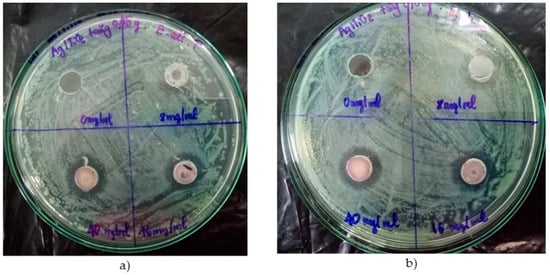 Photographs of antibacterial test against Escherichia coli bacteria (agar-well diffusion method) for Ag-loaded TiO2 nanoparticles: (a) without light irradiation; (b) under light irradiation). Concentration of 8, 16, and 40 mg/mL.