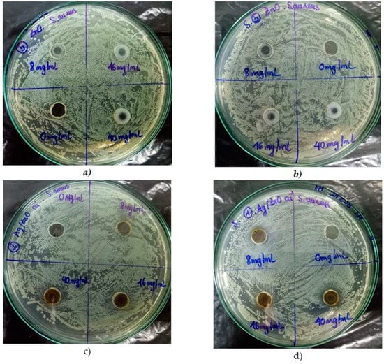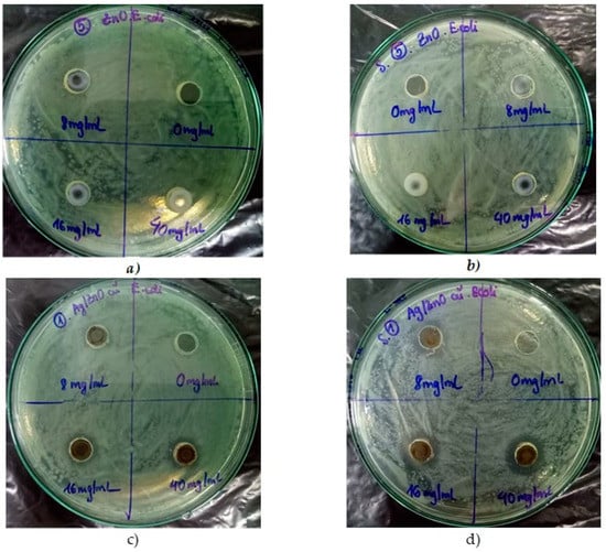 For Ag/ZnO nanohybrids, as shown in Table 3 and Table 4, light irradiation leads to an increase of the diameter of the inhibition zone for both S. aureus (at 8 mg/mL) and E. coli (at 8, 16, and 40 mg/mL) bacteria. Similarity, Ibanescu et al. [] reported the antimicrobial property of Ag/ZnO nanocomposites against both E. coli and M. luteus bacteria. Their finding indicates that small amounts of silver could significantly enhance antimicrobial activity. The photocatalytic activity of Ag/ZnO nanocomposites could also contribute to enhancing antimicrobial activity. Nagaraju et al. [] indicated an improvement of antimicrobial activity of Ag–ZnO NPs against both E. coli and S. aureus bacteria compared to pure materials. The inhibition zone could be observed at a concentration of 500 µg Ag–ZnO NPs. Wei et al. [] also described the high antibacterial activity of Ag–ZnO hybrid nanofibers against E. coli and P. aeruginosa bacteria.