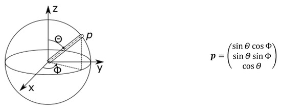 Spherical harmonics is based on the description of fiber orientation as a Laplace series or a generalized Fourier series [2]. Each twice-integrable function can be represented on the unit sphere surface as a series representation of tensors. The series can be carried out up to order . Due to the symmetry of , only even-order tensors are used here. In the following, the equations for the reconstruction by spherical harmonics are listed, and a general derivation of the equation can be found in [2,32]. The reconstruction of the fiber orientation is determined by the sum of the moments: