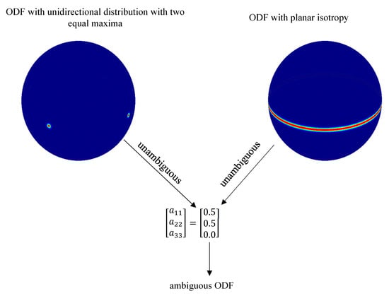 Mathematically, the problem of the reconstruction of an ODF based on fiber orientation tensors is ill-posed, since there is no unique solution (see Figure 2). One way to find a unique solution to an ill-posed problem is to use the maximum entropy method. This method provides the solution that is coherent with the known information and has the highest entropy. The maximum entropy approach can be successfully applied to many ill-posed problems, such as spectral analysis or image restoration [33]. In the framework of the reconstruction of orientation tensors in order to consider anisotropic mechanical properties of short-fiber reinforced plastics, the maximum entropy approach is already applied in commercial software [34]. A summary and overview of the maximum entropy method is provided by Wu [33].