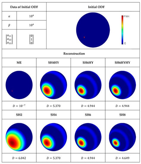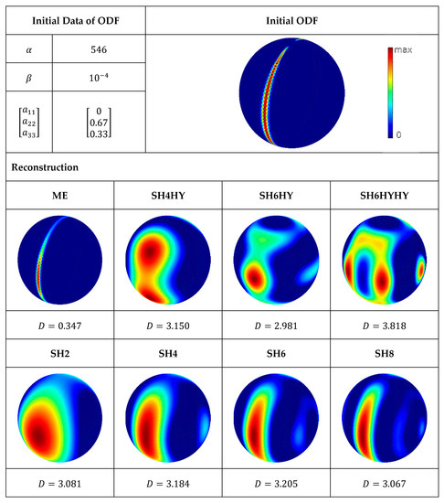 Figure 6 represents the next test scenario in comparison to the corresponding reconstructions. The ODF of this test scenario is characterized by a sharply limited distribution in the meridian plane, where the value at the pole positions is zero. The ME again provides the best reconstruction, where only the values of the ODF from pole to equator are slightly different. The sharp definition of the initial ODF at the poles of this test scenario is reconstructed more diffusely. The reconstructions SH2 to SH8 deliver, as expected, a too-broad ODF due to the too-few moments of spectral approximation. The secondary maxima are more pronounced in this test scenario than in the previous ones. In this test scenario, the effect of using the hybrid closure to calculate the higher tensors is particularly interesting. The reconstruction SH4HY shows two equal maxima, which are symmetrically arranged to the equatorial plane. Nevertheless, the Kullback–Leibner distance with is approximately equal to the Kullback–Leibner distance of the reconstruction SH4. The reconstruction SH4HY illustrates the problems of using closures. Assumptions or, generally speaking, the applicability of a closure, cannot be supposed to be true in a reconstruction problem, since no information about the original ODF is known. Accordingly, the use of closures can be doubtful for the reconstruction, although higher moments are used which should be beneficial for sharply limited ODFs.