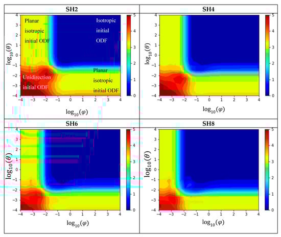 In the following, all test scenarios for the evaluation of the reconstruction methods are compared against each other. First, the methods SH2 to SH8 are analyzed. The Kullback–Leibner distance as a function of the logarithmically covariances and is shown in Figure 9. The value of the Kullback–Leibner distance is represented by a color. The figure shows that the reconstruction methods SH2 to SH8 are qualitatively very similar. In the range of nearly unidirectional initial fiber orientation, the Kullback–Leibner distance is large, whereas in the range of isotropic initial fiber orientation, the Kullback–Leibner distance is nearly zero. As the number of moments increases, the Kullback–Leibner distance becomes smaller, but still not significant.