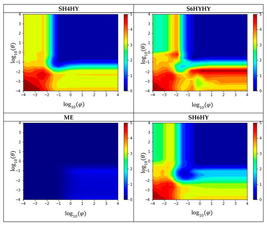 Color plot of the Kullback–Leibner distance in dependency of covariance (SH4HY, SH6HY, SH6HYHY, and ME).