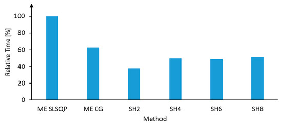 In Figure 11, the time is given relative to ME SLQP, which on average takes 1.29 s. It turns out that the SH2 method is the fastest. SH4 to SH8 are about 30% slower, although interestingly, there is no significant difference between SH4, SH6, and SH8. The ME method with the CG algorithm is about 65% slower than the SH2 method. With the SLSQP algorithm, the ME method is considerably slower than with the CG algorithm.