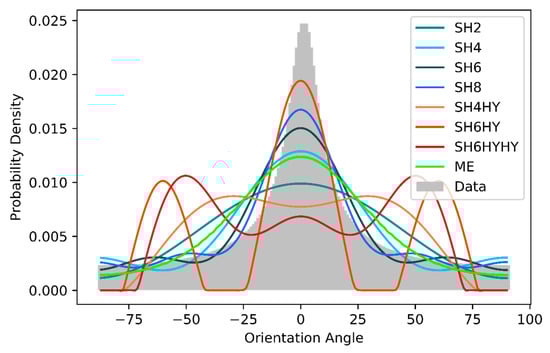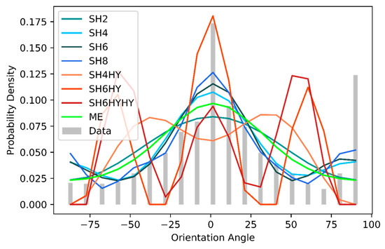 The second set of data was taken from [43]. The fiber orientation was measured by μComputer Tomography (µCT) of injection molded samples. Subsequently, the ODF was subdivided into shell and core layers, with the shell layer used here. In this dataset, the peak at 90° is particularly interesting in respect of to what extent it can be reconstructed (see Figure 13). In the area around the expected value, the behavior is basically similar to that of the first set of data. The methods SH2 to SH8 and ME underestimate the absolute value at the expected value. With SH2 and ME, the reconstructed probability at ±50° is again too high, and the peak at 90° cannot be reconstructed. Here, only the methods SH4, SH6, and SH8 can generate something that is similar to a second peak. The reconstruction methods with hybrid closure reconstruct several maxima symmetrically to the expected value again.